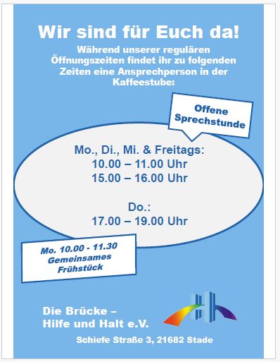 19. Februar 2026Ab sofort gibt es bei uns die offene Sprechstunde. Das heißt, Sie finden zu festen Zeiten eine Ansprechpartnerin in der Kaffeestube. Außerdem bieten wir immer montags das gemeinsame Frühstück an. Von 10:00 bis 11:30 frühstücken wir gemeinsam in der Kaffeestube. 2 Brötchen mit leckeren und gesundem Belag und 2 Tassen Kaffee für 3,00 € sorgen für einen guten Start in die Woche.